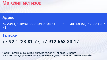 Магазин метизов по адресу 622051, Свердловская область, Нижний Тагил, Юности, 5 к1 в дальнейшем Организация, размещена в следующих категориях: