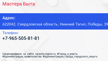 Мастера Быта по адресу 622042, Свердловская область, Нижний Тагил, Победы, 39 в дальнейшем Организация, размещена в следующих категориях: