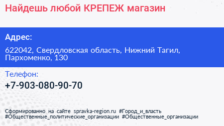 Найдешь любой КРЕПЕЖ, магазин по адресу 622042, Свердловская область, Нижний Тагил, Пархоменко, 130 в дальнейшем Организация, размещена в следующих категориях: