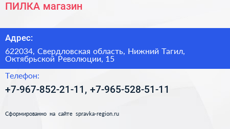 ПИЛКА, магазин по адресу 622034, Свердловская область, Нижний Тагил, Октябрьской Революции, 15 в дальнейшем Организация, размещена в следующих категориях: