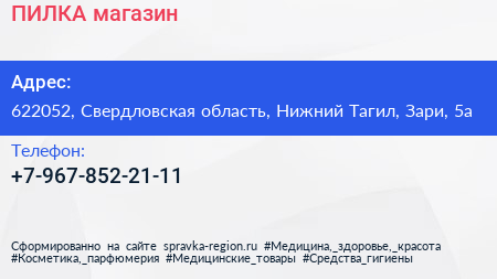 ПИЛКА, магазин по адресу 622052, Свердловская область, Нижний Тагил, Зари, 5а в дальнейшем Организация, размещена в следующих категориях: