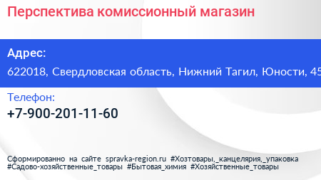 Перспектива, комиссионный магазин по адресу 622018, Свердловская область, Нижний Тагил, Юности, 45 в дальнейшем Организация, размещена в следующих категориях: