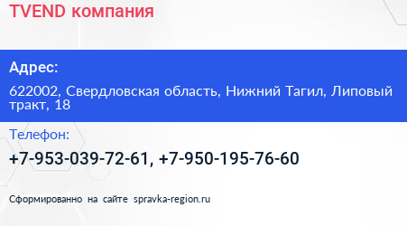 TVEND, компания по адресу 622002, Свердловская область, Нижний Тагил, Липовый тракт, 18 в дальнейшем Организация, размещена в следующих категориях: