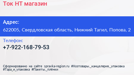 Ток НТ, магазин по адресу 622005, Свердловская область, Нижний Тагил, Попова, 2 в дальнейшем Организация, размещена в следующих категориях: