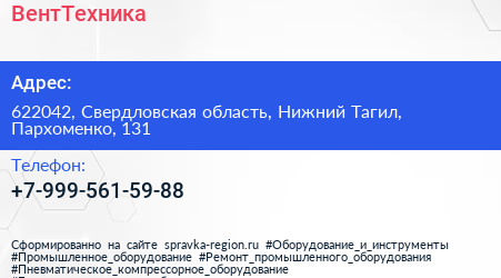 ВентТехника по адресу 622042, Свердловская область, Нижний Тагил, Пархоменко, 131 в дальнейшем Организация, размещена в следующих категориях: