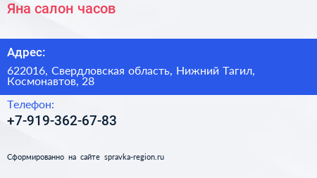 Яна, салон часов по адресу 622016, Свердловская область, Нижний Тагил, Космонавтов, 28 в дальнейшем Организация, размещена в следующих категориях: