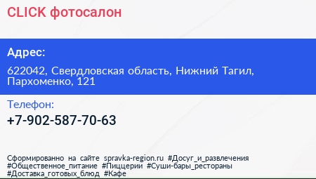 CLICK!, фотосалон по адресу 622042, Свердловская область, Нижний Тагил, Пархоменко, 121 в дальнейшем Организация, размещена в следующих категориях: