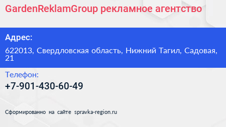 GardenReklamGroup, рекламное агентство по адресу 622013, Свердловская область, Нижний Тагил, Садовая, 21 в дальнейшем Организация, размещена в следующих категориях: