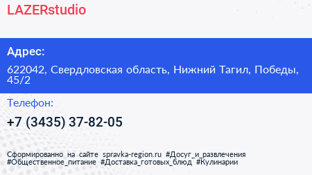 LAZERstudio по адресу 622042, Свердловская область, Нижний Тагил, Победы, 45/2 в дальнейшем Организация, размещена в следующих категориях: