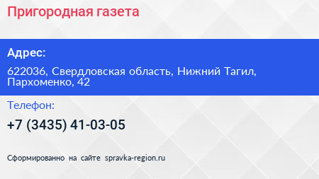 Пригородная газета по адресу 622036, Свердловская область, Нижний Тагил, Пархоменко, 42 в дальнейшем Организация, размещена в следующих категориях: