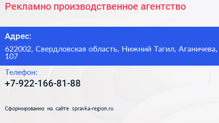 Рекламно-производственное агентство по адресу 622002, Свердловская область, Нижний Тагил, Аганичева, 107 в дальнейшем Организация, размещена в следующих категориях: