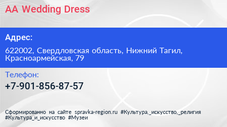 AA. Wedding Dress по адресу 622002, Свердловская область, Нижний Тагил, Красноармейская, 79 в дальнейшем Организация, размещена в следующих категориях:
