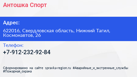 Антошка Спорт по адресу 622016, Свердловская область, Нижний Тагил, Космонавтов, 26 в дальнейшем Организация, размещена в следующих категориях: