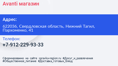 Avanti, магазин по адресу 622036, Свердловская область, Нижний Тагил, Пархоменко, 41 в дальнейшем Организация, размещена в следующих категориях: