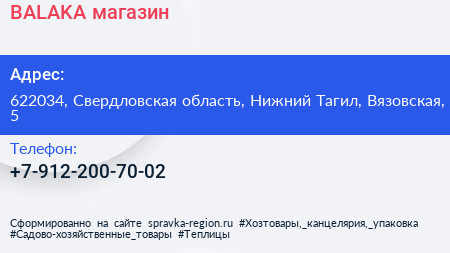 BALAKA, магазин по адресу 622034, Свердловская область, Нижний Тагил, Вязовская, 5 в дальнейшем Организация, размещена в следующих категориях: