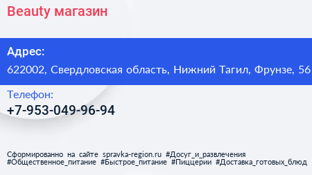 Beauty, магазин по адресу 622002, Свердловская область, Нижний Тагил, Фрунзе, 56 в дальнейшем Организация, размещена в следующих категориях:
