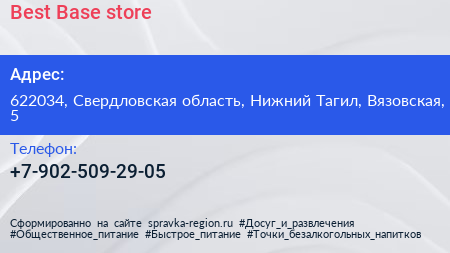 Best Base store по адресу 622034, Свердловская область, Нижний Тагил, Вязовская, 5 в дальнейшем Организация, размещена в следующих категориях: