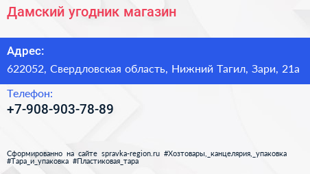 Дамский угодник, магазин по адресу 622052, Свердловская область, Нижний Тагил, Зари, 21а в дальнейшем Организация, размещена в следующих категориях: