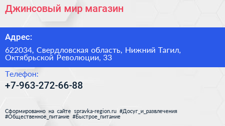 Джинсовый мир, магазин по адресу 622034, Свердловская область, Нижний Тагил, Октябрьской Революции, 33 в дальнейшем Организация, размещена в следующих категориях: