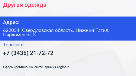 Другая одежда по адресу 622034, Свердловская область, Нижний Тагил, Пархоменко, 3 в дальнейшем Организация, размещена в следующих категориях: