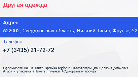 Другая одежда по адресу 622002, Свердловская область, Нижний Тагил, Фрунзе, 52 в дальнейшем Организация, размещена в следующих категориях: