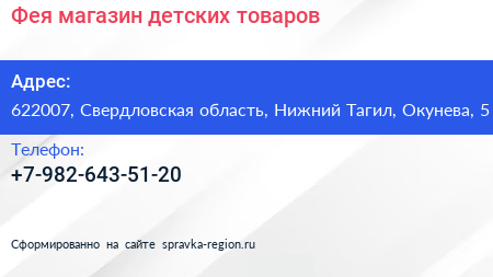 Фея, магазин детских товаров по адресу 622007, Свердловская область, Нижний Тагил, Окунева, 5 в дальнейшем Организация, размещена в следующих категориях: