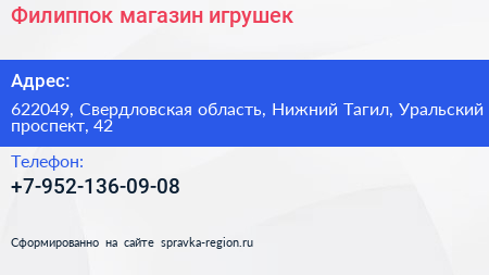 Филиппок, магазин игрушек по адресу 622049, Свердловская область, Нижний Тагил, Уральский проспект, 42 в дальнейшем Организация, размещена в следующих категориях: