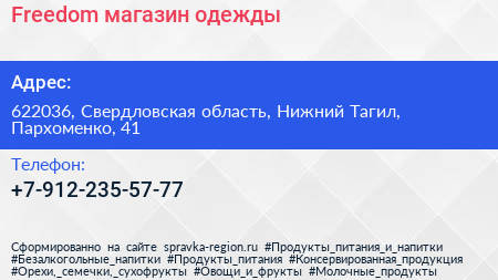 Freedom, магазин одежды по адресу 622036, Свердловская область, Нижний Тагил, Пархоменко, 41 в дальнейшем Организация, размещена в следующих категориях: