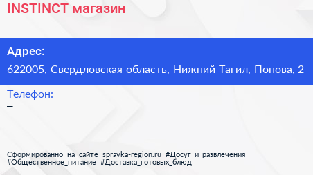 INSTINCT, магазин по адресу 622005, Свердловская область, Нижний Тагил, Попова, 2 в дальнейшем Организация, размещена в следующих категориях: