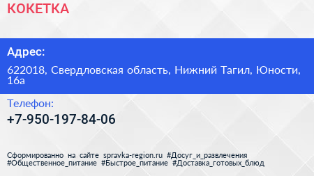 КОКЕТКА по адресу 622018, Свердловская область, Нижний Тагил, Юности, 16а в дальнейшем Организация, размещена в следующих категориях: