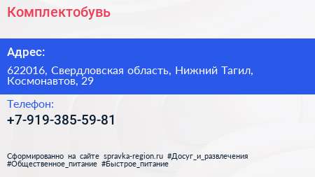 Комплектобувь по адресу 622016, Свердловская область, Нижний Тагил, Космонавтов, 29 в дальнейшем Организация, размещена в следующих категориях: