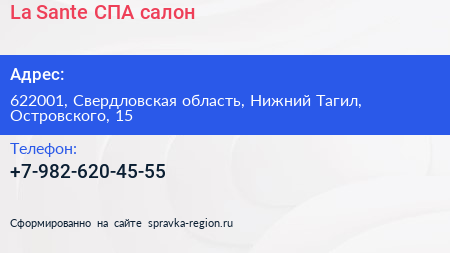 La Sante, СПА-салон по адресу 622001, Свердловская область, Нижний Тагил, Островского, 15 в дальнейшем Организация, размещена в следующих категориях: