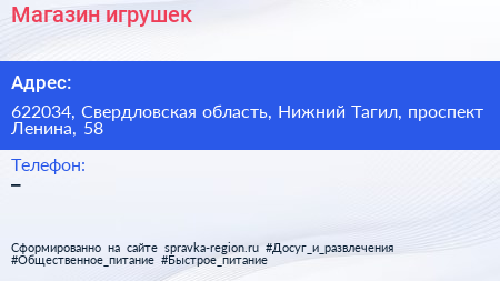 Магазин игрушек по адресу 622034, Свердловская область, Нижний Тагил, проспект Ленина, 58 в дальнейшем Организация, размещена в следующих категориях: