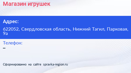 Магазин игрушек по адресу 622052, Свердловская область, Нижний Тагил, Парковая, 9а в дальнейшем Организация, размещена в следующих категориях: