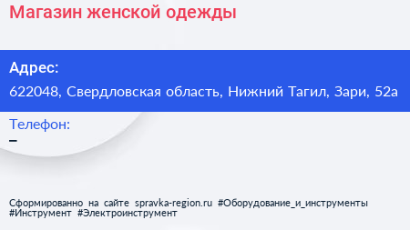 Магазин женской одежды по адресу 622048, Свердловская область, Нижний Тагил, Зари, 52а в дальнейшем Организация, размещена в следующих категориях: