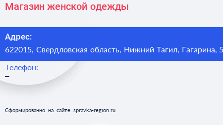 Магазин женской одежды по адресу 622015, Свердловская область, Нижний Тагил, Гагарина, 5 в дальнейшем Организация, размещена в следующих категориях: