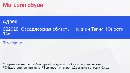 Магазин обуви по адресу 622018, Свердловская область, Нижний Тагил, Юности, 16в в дальнейшем Организация, размещена в следующих категориях: