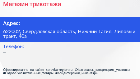 Магазин трикотажа по адресу 622002, Свердловская область, Нижний Тагил, Липовый тракт, 40а в дальнейшем Организация, размещена в следующих категориях:
