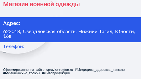 Магазин военной одежды по адресу 622018, Свердловская область, Нижний Тагил, Юности, 16в в дальнейшем Организация, размещена в следующих категориях: