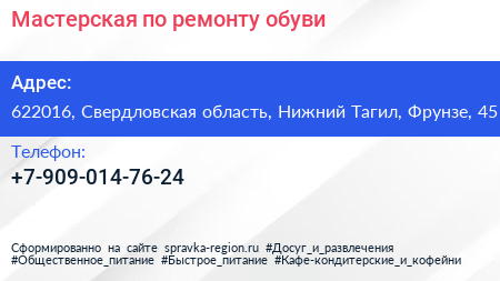 Мастерская по ремонту обуви по адресу 622016, Свердловская область, Нижний Тагил, Фрунзе, 45 в дальнейшем Организация, размещена в следующих категориях: