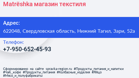 Matrёshka, магазин текстиля по адресу 622048, Свердловская область, Нижний Тагил, Зари, 52а в дальнейшем Организация, размещена в следующих категориях: