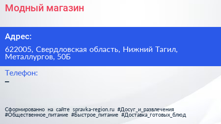 Модный, магазин по адресу 622005, Свердловская область, Нижний Тагил, Металлургов, 50Б в дальнейшем Организация, размещена в следующих категориях: