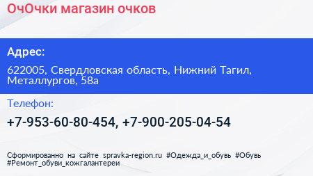 ОчОчки, магазин очков по адресу 622005, Свердловская область, Нижний Тагил, Металлургов, 58а в дальнейшем Организация, размещена в следующих категориях: