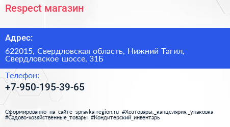 Respect, магазин по адресу 622015, Свердловская область, Нижний Тагил, Свердловское шоссе, 31Б в дальнейшем Организация, размещена в следующих категориях:
