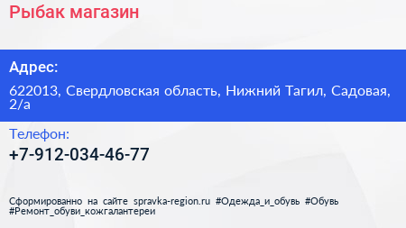 Рыбак, магазин по адресу 622013, Свердловская область, Нижний Тагил, Садовая, 2/а в дальнейшем Организация, размещена в следующих категориях: