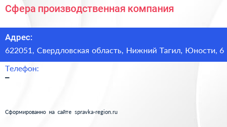 Сфера, производственная компания по адресу 622051, Свердловская область, Нижний Тагил, Юности, 6 в дальнейшем Организация, размещена в следующих категориях: