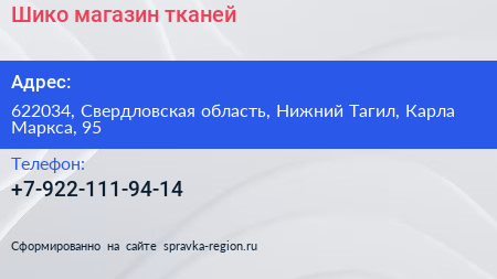 Шико, магазин тканей по адресу 622034, Свердловская область, Нижний Тагил, Карла Маркса, 95 в дальнейшем Организация, размещена в следующих категориях: