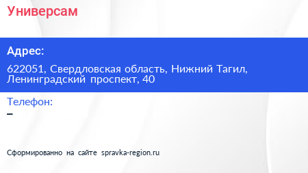 Универсам по адресу 622051, Свердловская область, Нижний Тагил, Ленинградский проспект, 40 в дальнейшем Организация, размещена в следующих категориях: