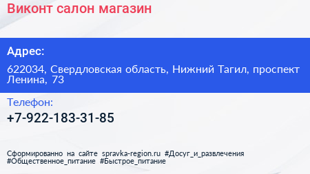 Виконт, салон-магазин по адресу 622034, Свердловская область, Нижний Тагил, проспект Ленина, 73 в дальнейшем Организация, размещена в следующих категориях: