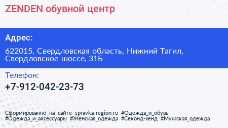 ZENDEN, обувной центр по адресу 622015, Свердловская область, Нижний Тагил, Свердловское шоссе, 31Б в дальнейшем Организация, размещена в следующих категориях: